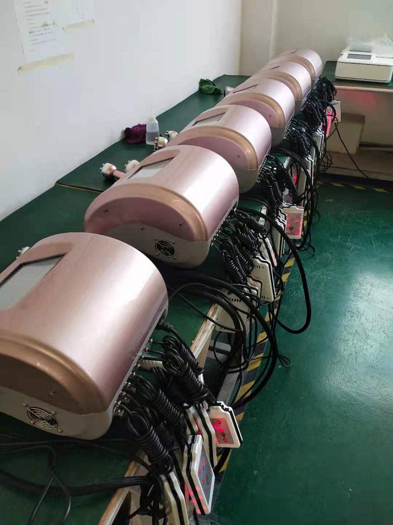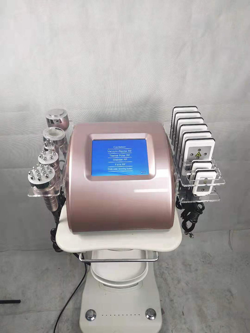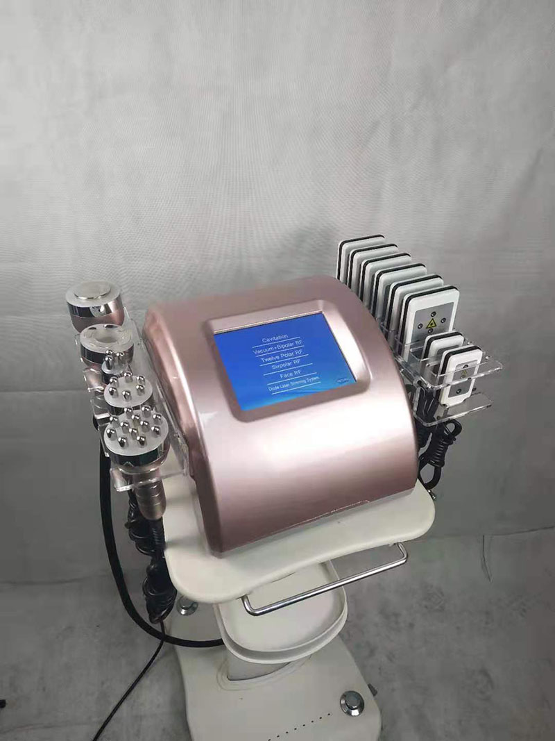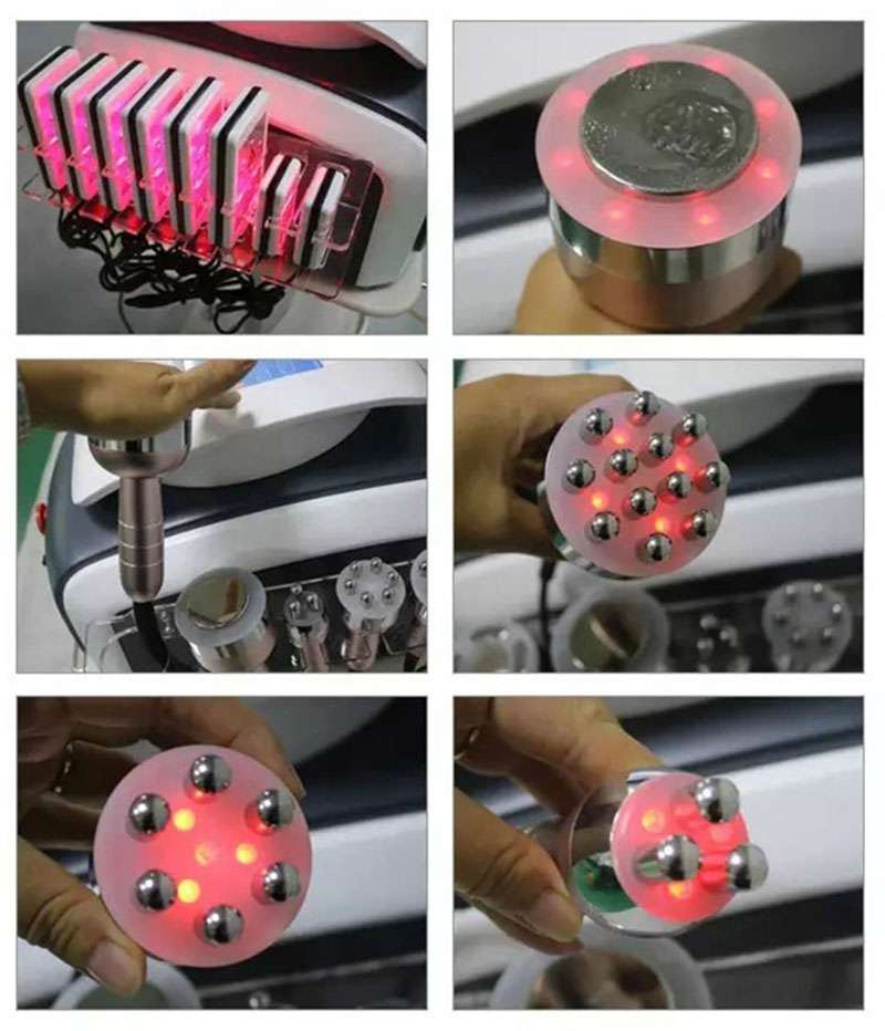 RF 1,1 MHz: agota el glicerol integrado y los ácidos grasos libres a través de la circulación hepatoenteral. Cavitación de 2.40 KHz: emitida para hacer vibrar las células grasas a la velocidad máxima para promover la motivación de las células a fin de reducir la grasa. 3.RF al vacío: enfoca la energía de RF en un área específica para reducir la grasa, acelerar el metabolismo, aliviar la fatiga muscular y tensar la piel mediante la entrega de energía térmica y un masaje de succión. 4.Martillo frío: encoge los poros, hace que la piel sea firme y elástica, reduce las arrugas, contrae los vasos sanguíneos, diluye eficazmente las manchas rojas e hinchadas, calma la piel. 5.Lipolaser: emite niveles bajos de energía láser que crea una señal química en las células grasas, descomponiendo los triglicéridos almacenados en ácidos grasos libres, glicerol y moléculas de agua que luego son transportadas por todo el cuerpo por el sistema linfático para abastecer al cuerpo con energía.