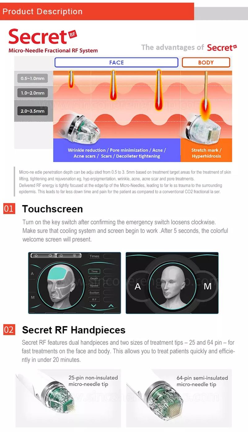 Gold RF Micro-crystal es la unión inteligente de microcristal y RF. La palabra dorada proviene de microcristales con membrana chapada en oro, el exterior del microcristal es dorado si la membrana de la placa. Al tratar, los médicos ajustan la profundidad de penetración de los microcristales y la energía de RF de acuerdo con el cristal y las partes del tratamiento. Luego, bajo el control del sistema electrónico, docenas de microcristales aislantes penetran rápidamente en la piel al mismo tiempo, emiten energía de RF desde la cúspide del microcristal y luego salen rápidamente. Operar como este y repetir hasta finalizar el tratamiento. Por último, pinte los ingredientes cosméticos.